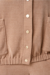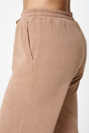 Стильный женский костюм, выполнен из трикотажного полотна в рубчик. Костюм состоит из бомбера и брюк. Бомбер свободного силуэта, с центральной застежкой на кнопки. По переду накладные карманы, горловина обработана плоско-лежащей стойкой. Рукава со спущенной проймой, низ рукава и бомбера собран на резинку. Бомбер без подкладки. Брюки свободные, немного расширенные от бедра, в боковых швах карманы, пояс на резинке с декоративным шнуром. Длина бомбера – 62 см Длина рукава – 54 см Длина брюк – 107 см
