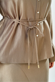 Элегантный женский костюм из ткани с небольшим блеском. Костюм состоит из блузы-рубашки и юбки. Рубашка свободного силуэта с центральной застежкой на петли пуговицы, горловина с рубашечным воротником. Рукава со спущенной проймой, по низу притачной волан с резинкой. Юбка расширенная к низу, по переду фигурный рельеф с разрезом по низу, застежка в среднем шве спинки на тесьму молния. Юбка на подкладке. В комплект входит тонкий пояс- шнурок.