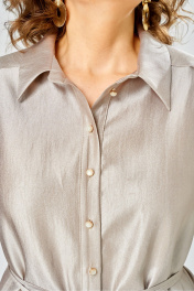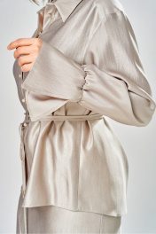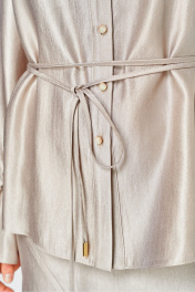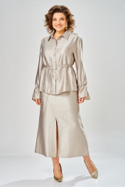 Элегантный женский костюм из ткани с небольшим блеском. Костюм состоит из блузы-рубашки и юбки. Рубашка свободного силуэта с центральной застежкой на петли пуговицы, горловина с рубашечным воротником. Рукава со спущенной проймой, по низу притачной волан с резинкой. Юбка расширенная к низу, по переду фигурный рельеф с разрезом по низу, застежка в среднем шве спинки на тесьму молния. Юбка на подкладке. В комплект входит тонкий пояс- шнурок.