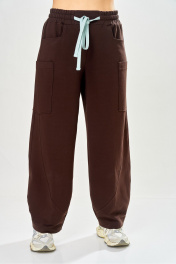 Стильный женский костюм, выполнен из футера. Состоит из свитшота и брюк. Свитшот свободного силуэта со спущенной линией плеча. Горловина оформлена капюшоном, по переду два накладных кармана. В боковых швах разрезы. Рукава с манжетом и сборкой по низу. На кармане декоративная нашивка. Брюки свободного силуэта, заужены к низу. В боковых швах карманы с подрезным бочком, на уровне бедер накладные карманы. Верх брюк оформлен поясом на резинке. В пояс вставлен шнур. Длина свитшота – 58 см Длина рукава – 44 см Ширина плеча – 25 см Длина брюк по боковому срезу – 108 см Длина брюк по шаговому шву – 78 см