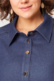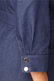 Стильное женское платье выполнено из джинсовой ткани. Платье полуприлегающего силуэта с рельефными швами по переду и спинке, застежка центральная с планкой на петли пуговицу. По всем швам проложены отделочные строчки. По переду на уровне бедер накладные карманы с декоративными элементами. Горловина оформлена воротником на стойке. Рукава втачные длина ¾ по низу притачной манжет. Платье без подкладки. Длина платья – 108 см Длина рукава – 47,5 см