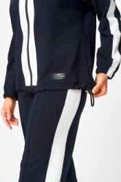 Спортивный женский костюм из футера. Состоит из свитшота и брюк. Свитшот свободного силуэта с центральной застежкой на молнию. Горловина круглая. В нижнюю планку вставлен шнур с фиксаторами по боковым швам. Рукава втачные с лампасом из отделочной ткани, по низу резинка. Брюки свободного силуэта, с лампасами по боковому шву. В боковых швах на уровне бедер карманы, верх брюк на поясе с резинок. Длина свитшота – 67 см Длина рукава – 52 см Длина брюк по боковому срезу – 110 см