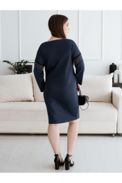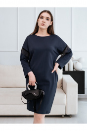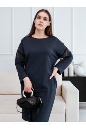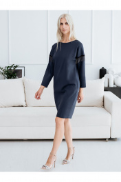 Женское нарядное платье. Силуэт платья бочонок/кокон. Линия плеча спущена, рукав браслетной длины. Пройма рукава декорирована тесьмой с металлическими цепочками. Платье изготовлено из плотного вискозного эластичного полотна, ткань не просвечивается, хорошо держит форму, цвет серый с синим оттенком. Размер платья на девушке блондинке 44, параметры девушки 174-84-69-94, на девушке брюнетке 46, параметры девушки 172-93-69-98.