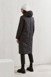 Пальто женское,длиной ниже линии колен,с длинными втачными рукавами,воротником-стойкой и прорезными карманами в рельефных швах по переду.Пальто со съемным капюшоном на кнопках.Застежка изделия на молнию и кнопки по планке.