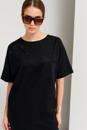 Платье женское прямого силуэта,длиной ниже линии колен,с цельнокроеными короткими рукавами,нагрудными вытачками и горловиной круглой формы.По переду изделия на уровне линии груди накладной карман.Застежка изделия на петли и пуговицы по спинке на планке.