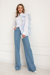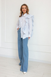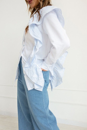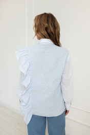 Блузка рубашечного кроя, прямого силуэта, с втачным одношовным рукавом внизу на манжете с застежкой на петли-пуговицы. Полочка с рельефами, в левый вставлен волан, переходящий на спинку, правая полочка с надстрочным карманом. Спинка с вертикальным рельефом слева, в который вставлен волан, переходящий на полочку. Воротник рубашечный, отложной на стойке. Застёжка центральная, отрезая планка с застежкой на петли-пуговицы.