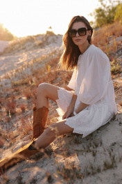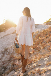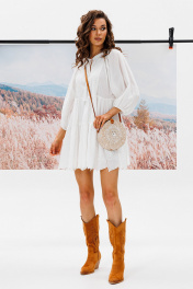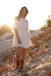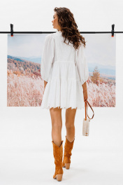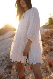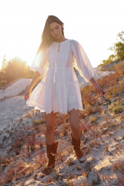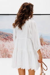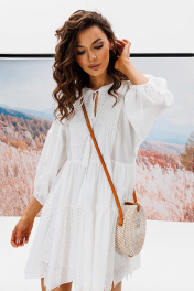 Платье летнее А-силуэта, отрезное по линии талии, из хлопкового шитья, с цельнокроеным рукавом из тонкого хлопка и внизу со сборкой на резинке. По лифу вставка из шитья с настрочной кружевной тесьмой. По низу платья волан из шитья с отделочной кружевной хлопковой тесьмой. По спинке вставка из шитья также с кружевной настрочной хлопковой тесьмой. Воротник-стойка с завязками и кисточками по низу. Платье на подкладке из тонкого хлопка