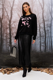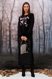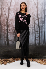 Джемпер из трикотажного полотна "пенка", укороченный, прямого силуэта с втачным рукавом и спущенной линией плеча. По низу рукавов манжета из довяза. По переду печать "Branches" в розовом цвете. По низу изделия и горловине планка из довяза.