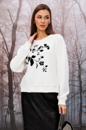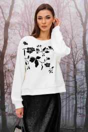 Джемпер из трикотажного полотна "пенка", укороченный, прямого силуэта с втачным рукавом и спущенной линией плеча. По низу рукавов манжета из довяза. По переду печать "Branches" в розовом цвете. По низу изделия и горловине планка из довяза.