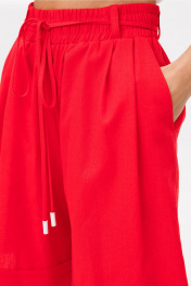 Шорты льняные на притачном отстроченном поясе со шлевками, в которые втянут шнурок из основной ткани с наконечниками. По переду со складками от притачного пояса и карманами в боковых швах с наклонным входом. По низу шорт манжета.