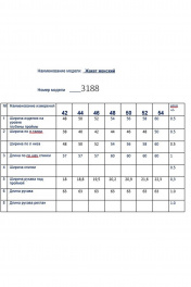 Жакет из велюровой ткани полуприлегающего силуэта, с втачным двухшовным рукавом. Полочка и спинка с отрезной баской по линии талии. Полочка с V-образным вырезом, однобортной застежкой на петли пуговицы и талиевой вытачкой от баски. Спинка с центральным швом. Жакет с отрезным бочком, переходящим на полочку и на спинку. Жакет на подкладке.