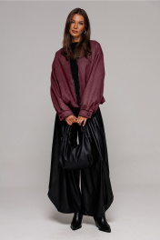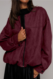 Жакет-бомбер из искусственной замши свободного силуэта со спущенной линией плеча. Рукав втачной двухшовнный, внизу со складками, притачной манжетой с застежкой на кнопку. Полочка с застежкой на тесьму молнию, с кокеткой и карманами с застежкой на молнию. Синка с кокеткой. По горловине планка из довяза. Низ жакета-бомбера со сборкой. Изделие на подкладке.