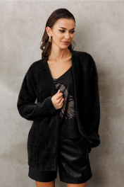 Кардиган из трикотажного полотна свободного силуэта слегка заужен к низу, со спущенной линией плеча и втачным рукавом. Полочка с V-образным вырезом и центральной застежкой на пришивные кнопки. Без подкладки.