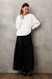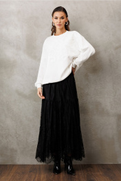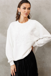 Джемпер из технологичного трикотажного полотна с эффектом peach. Прямого силуэта с втачным рукавом и спущенной линией плеча, с манжетой из отделочной ткани по низу рукава. По переду вышивка "Орнамент". По горловине и низу изделия притачная планка из отделочной ткани.