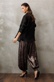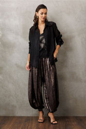 Брюки-шаровары свободного силуэта, внизу на резинке, на притачном отсроченном поясе, со вставленной в него резинкой. Полочка с карманом в рельефе. По переду и спинке фигурные рельефы.