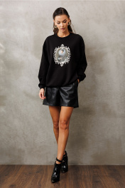 Джемпер из технологичного трикотажного полотна с эффектом peach. Прямого силуэта с втачным рукавом и спущенной линией плеча, с манжетой из отделочной ткани по низу рукава. По переду печать с вышивкой "Queen". По горловине и низу изделия притачная планка из отделочной ткани.