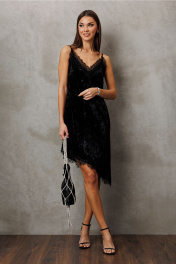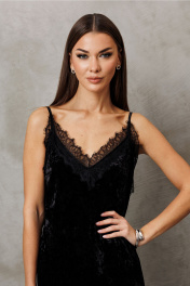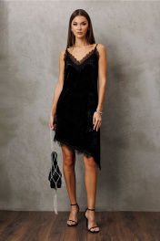 Платье из велюра с кружевом на регулируемых бретелях и асимметричным низом. Платье полуприлегающего силуэта, верху на широкой обтачке. Полочка с V-образным вырезом и кружевом по вырезу и нагрудной вытачкой. По низу платья кружево.