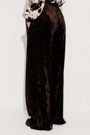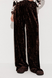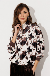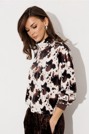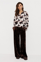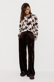 Костюм велюровый 2-ух предметный. Джемпер из принтованного велюра прямого силуэта с втачным рукавом и спущенной линией плеча, с манжетой из довяза по низу рукава. По переду молния и нашивка "BUTER". Воротник-стойка. По низу подгибка со вставленной в него эластичной тесьмой и фиксатором, благодаря которому низ можно затянуть. Брюки из однотонного велюра на цельнокроеном отстроченным поясе со вставленной в него резинкой. Брюки прямого силуэта с карманами в боковых швах.