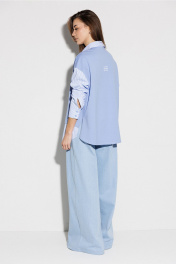 Блузка, комбинированная прямого силуэта, с втачным одношовным рукавом, со складкой и манжетой, с застежкой на петли-пуговицы и спущенной линией плеча. Полочка из трикотажа и рубашечной ткани с центральной застежкой на петли-пуговицы и вышивкой "Самолет". Спинка из трикотажа с печатью "BUTER". Воротник рубашечный отложной на стойке. Спинка и полочка с фигурным низом. Внизу по боковым швам обработаны разрезы.