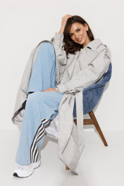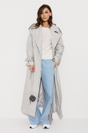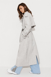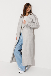 Плащ-тренчкот длинный прямого силуэта с двубортной застежкой на петли-пуговицы, втачным двух шовным рукавом и спущенной линией плеча, по низу рукавов паты с пряжкой. Воротник пиджачного типа - отложной с лацканом. Полочка с карманом-листочкой. Спинка со средним швом заканчивающимся шлицей и с отлетной кокеткой. По плечевому шву погон с застежкой на петлю-пуговицу. Тренчкот со съемным поясом с пряжкой. Плащ на подкладке.
