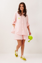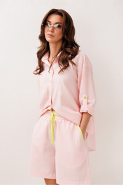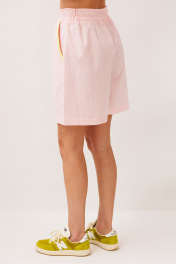 Шорты хлопковые на притачном отстроченном поясе со втянутым в него шнурок из отделочной ткани с наконечниками. По переду карман в боковых швах с наклонным входом, который обработан притачной планкой из отделочной ткани.
