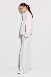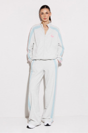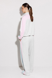 Брюки мультиколор трикотажные (2-хнитка) прямого силуэта на цельнокроеном отстроченном поясе со вставленной в него резинкой и декоративным шнурком. По бокам лампасы из ткани другого цвета и карманом-листочкой от бокового шва.