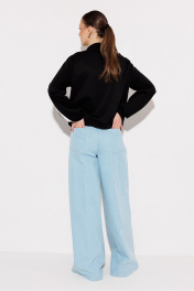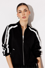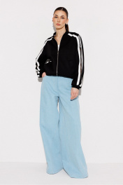 Джемпер из технологичного трикотажного полотна с эффектом peach. Прямого силуэта с втачным рукавом со вставкой из кружева и настроченными хлопковыми лампасами, переходящими на плечо и манжетой из отделочной ткани по низу рукава. Полочка с центральной застежкой на тесьму-молнию и карманом-листочкой и нашивкой с гравировкой "BUTER". По горловине и низу изделия притачная планка из отделочной ткани.