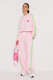 Джемпер трикотажный прямого силуэта с втачным рукавом и спущенной линией плеча, с манжетой по низу рукава. По плечу и рукаву вставка с 2-мя настроченными лампасами. Полочка с печатью "Cherry". По горловине притачная планка. В подгибку низа втянут шнурок благодаря чему изделие можно затянуть.