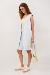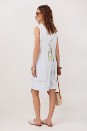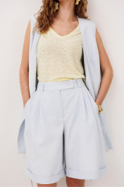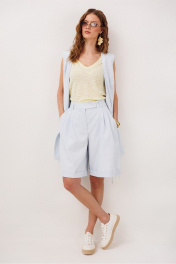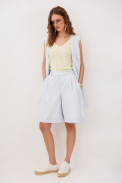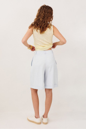 Шорты-бермуды на притачном поясе с уступом и застежкой-гульфик. Пояс со шлевками, с застежкой на петлю-пуговицу и потайную петлю-пуговицу. Перед с двумя складками от пояса и карманом в боковом шве с наклонным входом. По низу шорт манжета.