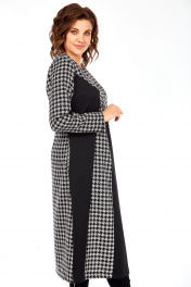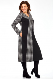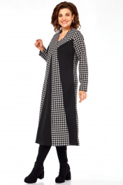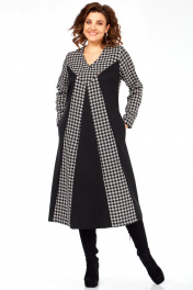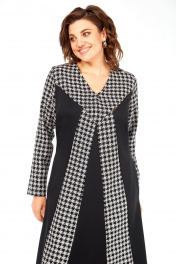 Это платье сочетание классического принта ""гусиная лапка"" и смелых черных блоков создает уникальный, запоминающийся образ, который точно соберет комплименты. Продуманное расположение вертикальных черных и принтованных панелей визуально вытягивает силуэт, делая вас стройнее и выше. V-образный вырез дополнительно подчеркивает изящество шеи. Благодаря свободному А-силуэту и длине миди, это платье идеально подходит для активного дня – от деловых встреч до культурных мероприятий. Оно одинаково стильно смотрится с каблуками, ботильонами или даже кедами. Это уверенный, строгий и одновременно харизматичный образ для тех, кто предпочитает четкость линий и графическую выразительность, подчеркивающую их индивидуальность и вкус. Технические детали Платье миди в графичном дизайне в свободном А-силуэте, плавно расширяющийся от груди к низу, обеспечивающий максимальный комфорт и непринужденную элегантность. Классический V-образный вырез, который визуально удлиняет шею. Рукава и часть лифа (верхняя внешняя часть плеч и рук) выполнены из ткани с классическим черно-белым принтом ""гусиная лапка"". Центральная часть лифа спереди оформлена двумя крупными, контрастными черными треугольными вставками, которые сходятся к вершине V-образного выреза. Эти вставки создают четкий, динамичный геометрический рисунок. Рукава длинные, втачные, из ткани ""гусиная лапка"", без дополнительных декоративных элементов на манжетах. Спинка платья безцентрального шва с выточками для лучшего прилегания модели. В платье имеются боковые карманы для большего удобства. Длина рукава 62 см длина платья 115см