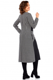 Это платье — манифест графического минимализма и интеллектуальной моды. Оно смело переосмысливает классику, превращая узнаваемый принт ""гусиная лапка"" в основу для футуристической, но при этом невероятно элегантной композиции. Асимметричный вырез горловины и сложный, но гармоничный геометрический крой на лифе и юбке создают ощущение движения и оптической иллюзии, притягивая взгляд и не давая ему заскучать. Черные панели словно вырезаны из пространства, играя с объемами и линиями, и выстраивая новую архитектуру силуэта. Продуманное расположение черных геометрических вставок оптически стройнит и вытягивает силуэт, создавая идеальные пропорции. Вы будете чувствовать себя уверенно и выглядеть безупречно. Платье для женщины, которая не боится быть в центре внимания, но делает это с помощью изысканности и продуманного стиля, а не ярких кричащих деталей. Это одежда для тех, кто ценит модернизм, смелость в дизайне и безупречный вкус, способный сочетать строгость и динамичность. В этом платье чувствуется уверенность, внутренняя сила и понимание тонких нюансов современного стиля. • Длина платья (117 см) и рукава (62 см)