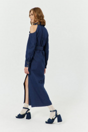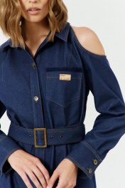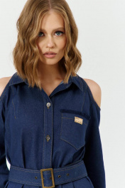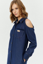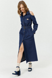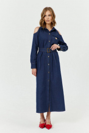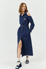 Платье женское А-силуэта с открытой линией плеч, с застежкой с планками на 7 прорезных петель и пуговиц. Перед с вырезом по плечу, с нагрудными вытачками и накладным карманом на левой полочке. Карман с настроченной нашивкой. Спинка с вырезом по плечу. В боковых швах обработаны карманы - «в швах». Рукава втачные, одношовные, длинные с притачной по низу манжетой с разрезом и складками по шву притачивания манжеты. Манжета застёгивается на 2 петли и пуговицы. Воротник – рубашечный с отрезной стойкой. В комплекте - пояс, с металлической пряжкой и люверсами.