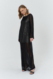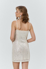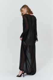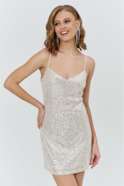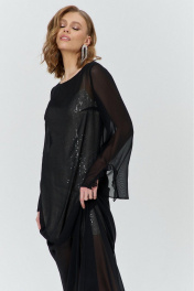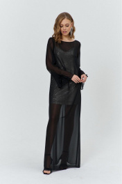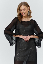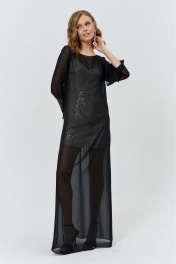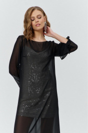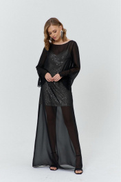 Комплект женский, состоящий из нижнего короткого платья, и верхнего, полупрозрачного длинного платья. Нижнее платье прилегающего силуэта, выполнено из материала с пайетками на трикотажной основе. Перед с нагрудными и талиевыми вытачками. Спинка с талиевыми вытачками. Платье на трикотажной подкладке и с регулируемыми по длине бретелями. Верхнее платье силуэта трапеция, длинное, выполнено из полупрозрачного шифона. Перед с нагрудным вытачками. Спинка без конструктивных элементов. Вырез горловины-«лодочка». Рукава втачные одношовные длинные, с вырезом по низу и притачанным к вырезу воланом.