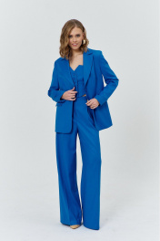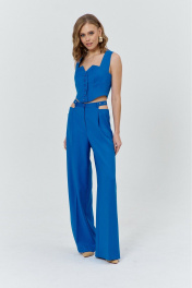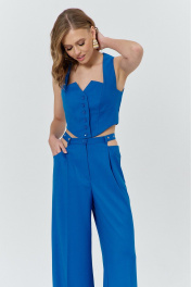 Жилет женский укороченный с фигурной линией низа; с центральной бортовой застежкой на 6 прорезных петель и пуговиц. Перед с рельефами и отрезной чашкой, доходящей до центрального рельефа. Верхняя часть -бретели. Спинка со средним швом и рельефами от проймы до низа. Жилет на подкладке. Длина по спинке-37,5
