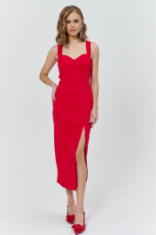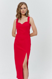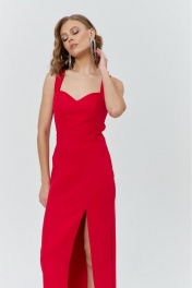 Платье женское нарядное прилегающего силуэта с застежкой на потайную тесьму-молнию в левом боковом шве. Перед отрезной по линии талии, с рельефами по лифу, с талиевой вытачкой по юбке справа и рельефом – слева, в нижней части которого обработан разрез. Нижняя часть спинки - со средним швом и талиевыми вытачками. Верхняя часть – с треугольным вырезом. Декор - настроченный над вырезом по спинке бант. Платье на бретелях. Вырез горловины - «сердечко». Длина платья по спинке без учета бретелей 110см