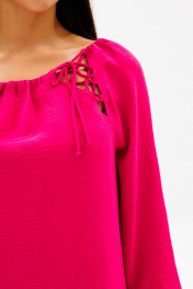 Платье женское силуэта - трапеция. Перед с вырезами по горловине, завязывающимися на шнуровку. Спинка без конструктивных элементов. Вырез горловины - «лодочка». Рукава – реглан, длиной ниже линии локтя.