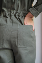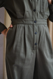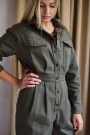 Комбинезон женский умеренного объема. Плечо слегка спущено, линия талии на естественном уровне. По переду накладные карманы с фигурными клапанами, втачанными в шов притачивания кокетки. По талии по два защипа справа и слева. По переду притачная планка, застежка на кнопках. По спинке отрезная кокетка. Воротник со стойкой.