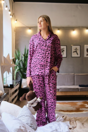 Женская пижамная рубашка свободного ситуэта. Цетральная бортовая застежка на пуговицы. Брюки прямого кроя. Пояс притачной на резинке..