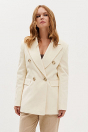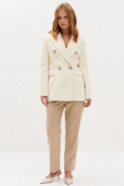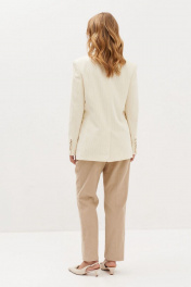 Жакет двубортный, полуприлегающего силуэта, на подкладке, длиной 69 см в 42 размере. Застежка на петли и пуговицы. По переду карманы «в рамку» с клапаном. Спинка со средним швом и шлицей. Рукав со шлицами и пуговицами (длина 60 см р 42)