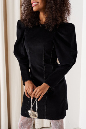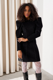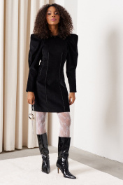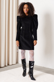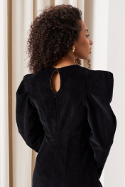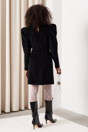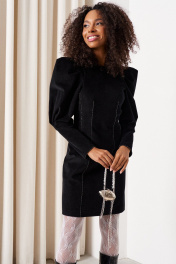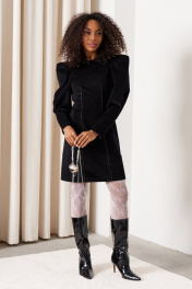 Платье прилегающего силуэта длиной 82 см. Рукав втачной объемный со складками по окату длиной 61 см., низ рукава со встречной складкой. Изделие с вытачками по переду и спинке. Застежка на потайную тесьму-молнию в среднем шве спинки и пришивной крючок. Горловина, низ рукава и вытачки декорированы тесьмой. Платье без подкладки.