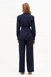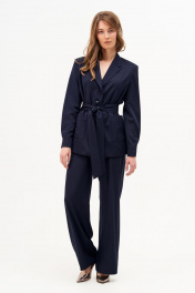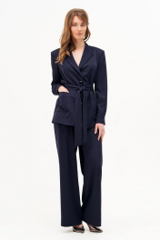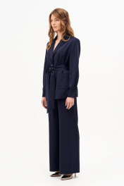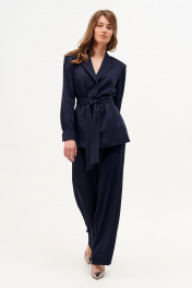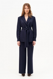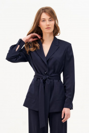 Жакет прямого силуэта из струящейся костюмной ткани. По переду накладные карманы. Рукав длинный втачной с манжетом на пуговицах. Воротник отложной с лацканами, застегивается на петли пуговицы, жакет однобортный. Жакет на подкладке, в комплекте пояс.