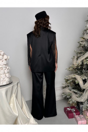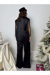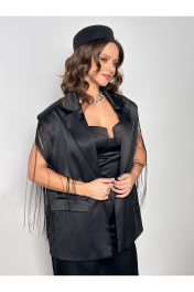Классический прямой жилет удлиненного кроя, создающий утонченный силуэт. Модель выполнена на подкладке для идеальной посадки и комфорта. Детали подчеркивают его статусность: отложной воротник с лацканами, прорезные карманы с клапанами и центральная застежка на пуговицу. Уникальность жилету придают съемные декоративные элементы с бахромой на проймах и элегантная шлица на спинке. Идеальная вещь для создания стильного многослойного образа. Жилет сочетается с брюками 14128, юбкой 12100, 12102