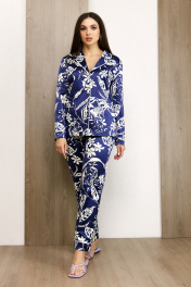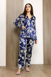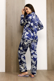 Элегантный домашний костюм-пижама выполнен из качественной ткани с содержанием хлопка. Материал очень приятен на ощупь, не электризуется, не деформируется при носке и стирке. Блуза свободного рубашечного кроя, с отложным воротником и лацканом. Спереди выполнена застежка на пуговицы. По боковым швам выполнены декоративные разрезы. Воротник, край борта, манжеты, накладные карманы и низ брюк отделаны контрастным кантом. Брюки свободного силуэта, пояс на резинке. Пижама женская с длинным рукавом может использоваться для дома, отдыха и сна.