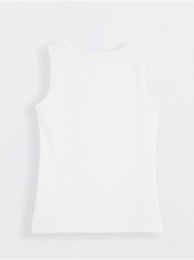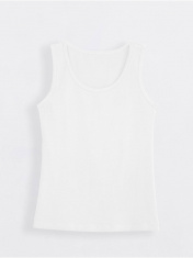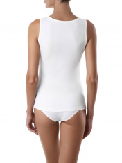 Майка женская бельевая из однотонного трикотажного полотна с глубоким вырезом горловины по переду. Горловина и пройма окантованы бейкой.