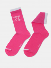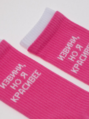 "Удлиненные носки мягкого хлопка в рубчик с надписью «Извини, но я красивее» станут креативным дополнением повседневного, спортивного или домашнего гардероба. Носки удобно облегают ногу, не сползают, дарят абсолютный комфорт и легкость. Устойчивы к многочисленным стиркам."