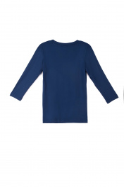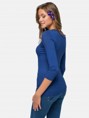 Джемпер женский из однотонного трикотажного полотна с втачным рукавом длиной 3/4. Круглая горловина изделия обработана планкой. По шву притачивания планки - отделочная строчка.