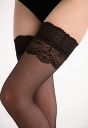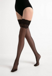 Тонкие эластичные фантазийные чулки 20 den с самоподдерживающейся кружевной резинкой. Рисунок:имитация ажурной резинке со швом, расположенным сзади ноги.