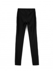 Леггинсы женские из однотонного трикотажного полотна. По боку вдоль ножки лампас из кожи переходящий вверху в фигурную кокетку. По шву лампаса и кокетки - отделочная строчка. Верх изделия обработан поясом с эластичной тесьмой внутри.