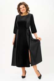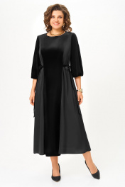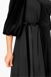 Платье женское, полуприлегающего силуэта, расширенное к низу. Состоит из двух видов ткани: трикотажа (велюр) и атласа. Линия плеча слегка расширена. Рельефы спереди и по спинке подчёркивают мягкие силуэтные линии. Немного завышена линия талии, которую подчеркивают декоративные ленты выполняющие роль пояса. Горловина спереди в форме «лодочки», со стороны спинки V-образный вырез горловины с поперечной планкой. По низу платья спереди обработан разрез. Рукава втачные, объём создают складки по низу. Изделие украшает декоративная тесьма по рукаву. Низ изделия обработан подгибом. Длина 129 см.