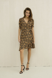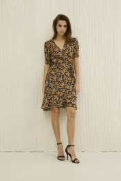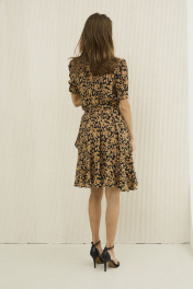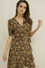 Платье женское, приталенного силуэта, выполнено из принтованного вискозного шелка высокого качества . Платье распашное на запах ,рукав втачной со сборкой . Вырез горловины Y-образный . Низ платья оформлен притачным воланом .